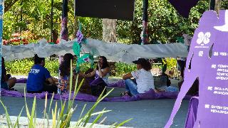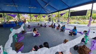 Durante todo o dia foi feita exposição de dados explicando os tipos de Violência Doméstica, aplicada dinâmica para atrair a atenção das visitantes do parque (tire foto e ganhe um brinde) e oferecidas sessões de meditação guiada.