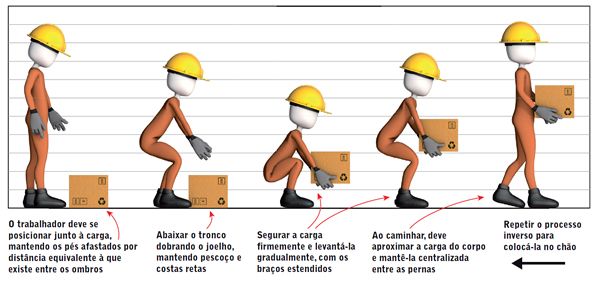 Cuidados com a coluna: Ao levantar peso, agache e coloque a força nas coxas e não na coluna. O peso deve ser carregado junto ao corpo, se necessário peça ajuda.