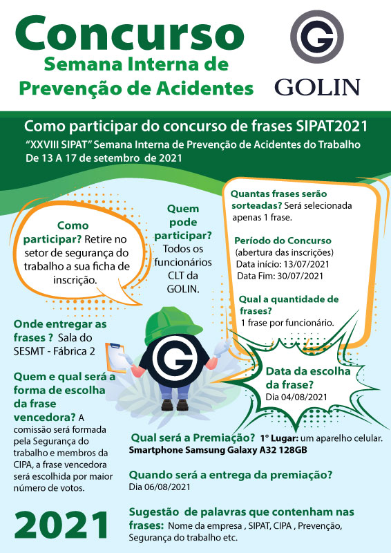 Pessoal, passando para contar que o concurso para a frase da SIPAT 2021 foi muito bom! Quem Ganhou este ano foi o Manuel, com a frase “Antes de trabalhar, lembre-se: Segurança em primeiro lugar.”