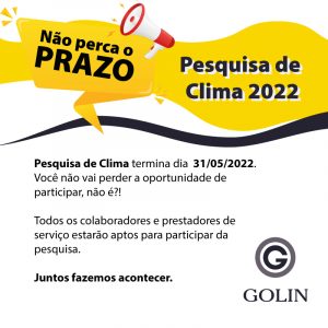 Olá, pessoal. Vamos ter a nossa pesquisa de clima organizacional 2022 acontecendo a partir de segunda-feira, dia 16/05/2022 até 31/05/2022. A sua participação é muito importante e contamos com o costumeiro engajamento de todos. No mural de divulgação do RH e pelo informativo por WhatsApp e e-mail, vocês receberão todas as orientações para acessar a…
