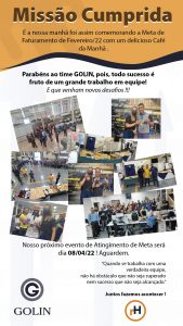 É a nossa manhã foi assim comemorando a Meta de Faturamento de Fevereiro/22 com um delicioso Café da Manhã . Parabéns ao time GOLIN, pois, todo sucesso é fruto de um grande trabalho em equipe. E que venham novos desafios !!! Nosso próximo evento de Atingimento de Meta será dia 08/04/22 ! Aguardem. “Quando se…