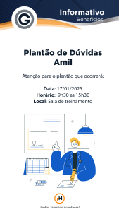 Atenção para o plantão que ocorrerá: Data: 17/01/2025 Horário: 9h30 as 15h30 Local: Sala de treinamento Juntos fazemos acontecer!